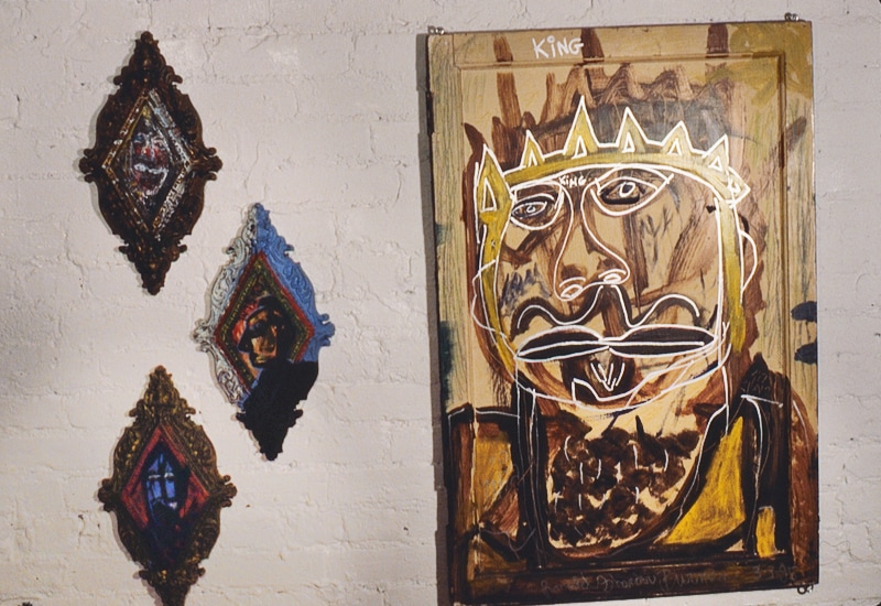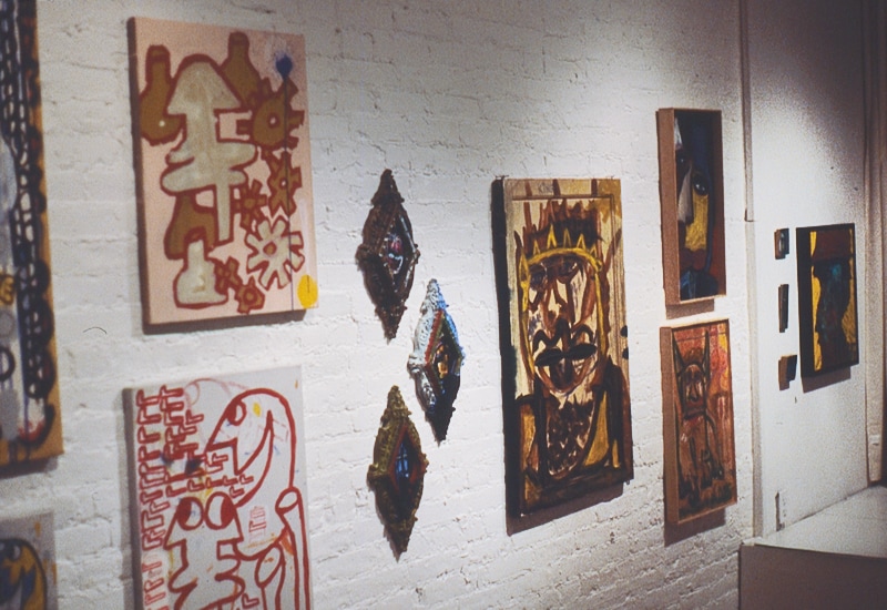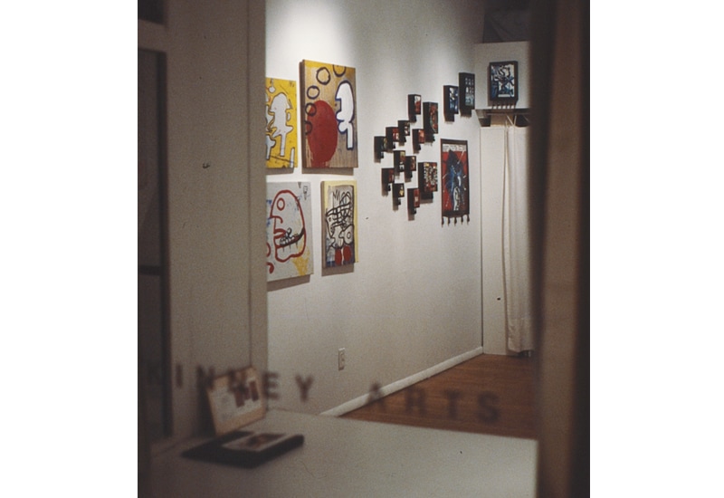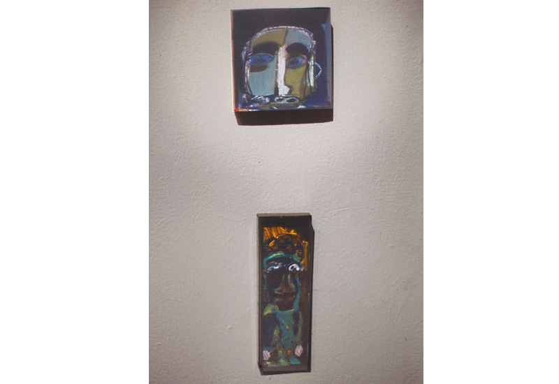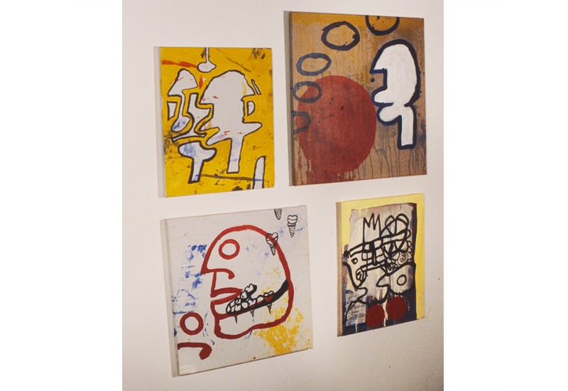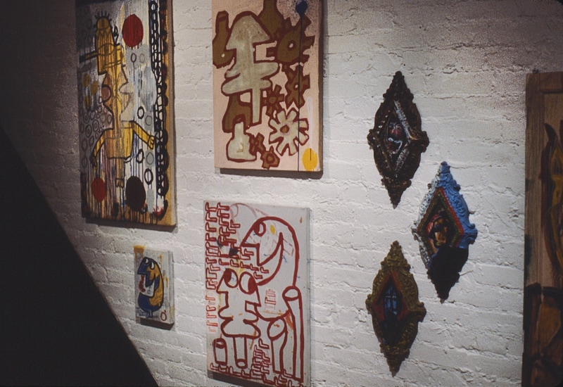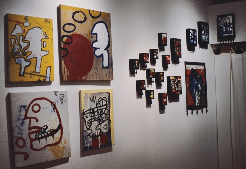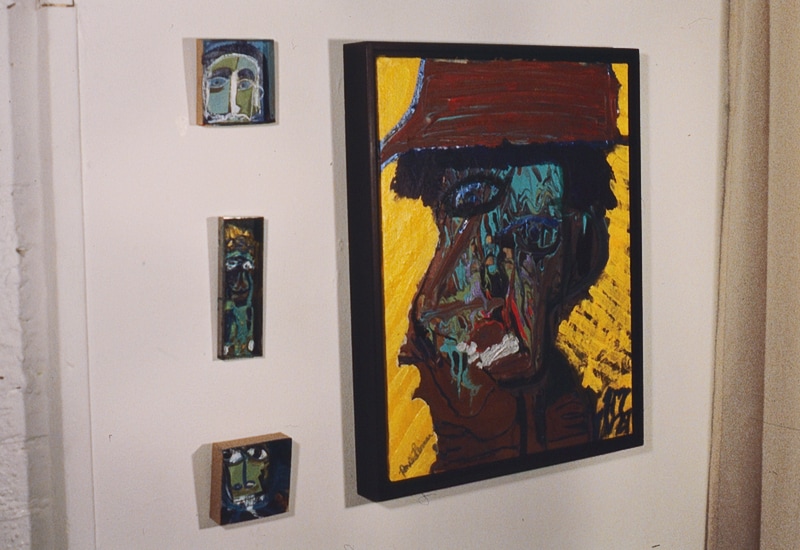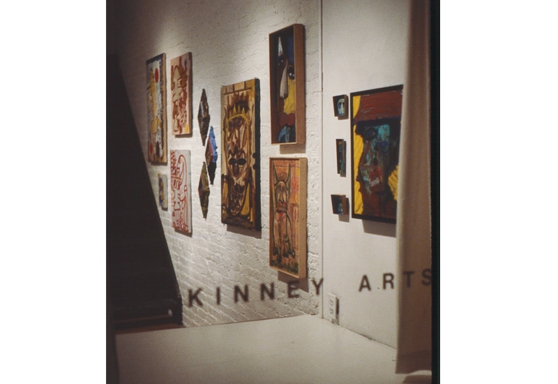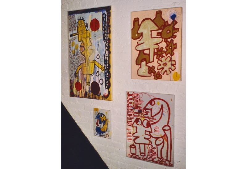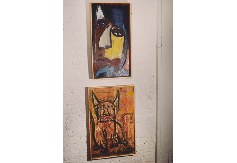 Ron Burman's paintings incorporate found objects from the streets of the East Village which are then covered with an array of figures. Scraps of wood, boxes, doors, windows and other miscellaneous items are transformed by the painted presence of bold, primal figures. Mr. Burman has not received any formal training in painting or art history, and therefore his imagery springs from an unaffected response to the people and situations surrounding him in the city.