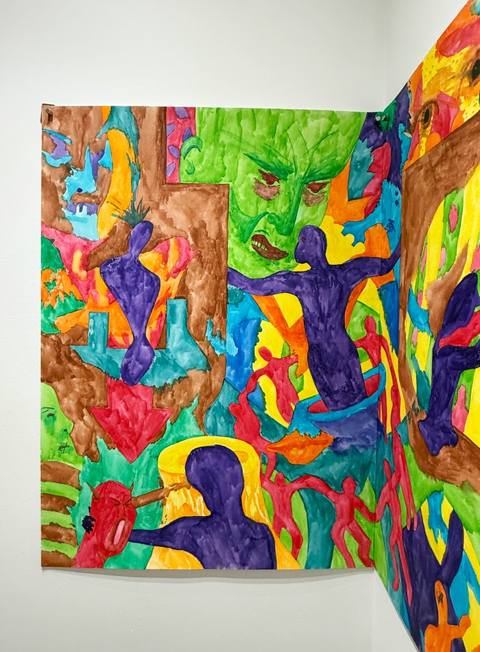 Imagine Wilde Things takes its name from a passage in Oscar Wilde's Salomé, which was originally written as a one-act play in French in 1893, and then translated into English a year later. Artist Mark McKinney was in college during the time period that these paintings were made, and was reading Wilde's work in one of his classes. The passage - and the idea - that magical turquoise stones applied to the forehead could allow the wearer to imagine things that didn't exist was an inspiration for these art works. In this particular installation, the wearer of the turquoises (at right) is looking across the room at this wild vision of figures interacting in a non-identifiable space. A closer look reveals a devil-like figure trying to penetrate the thoughts of a purple figure protected by an enveloping halo; a menacing green head looking down at another purple figure who looks up in defiance (and is surrounded by dancing figures not unlike those in Henri Matisse's masterpiece Dance; big brown eyes overlook more figures, reaching for and embracing each other.