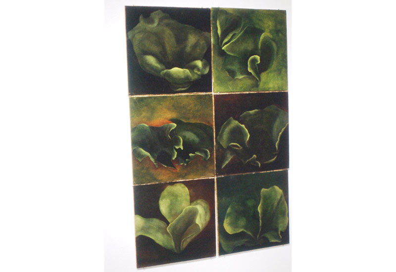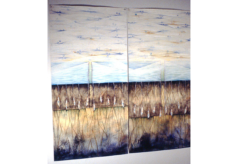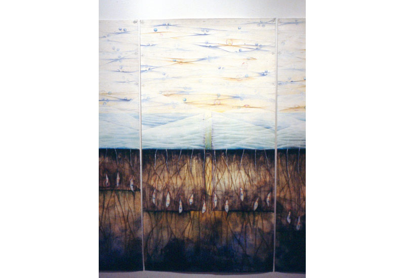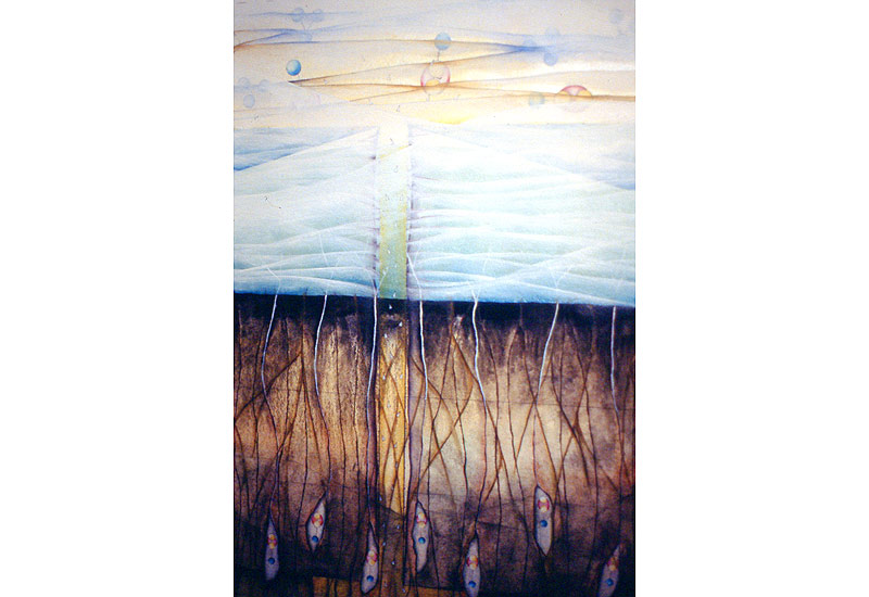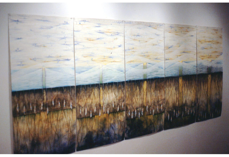 Also to be exhibited is a six panel canvas titled "Nitrous Oxide vs. Ozone: Deforestation," which shows the progression of toxic effects on the air and the soil. The imagery is abstacted from what might be considered a cross-section of the earth, with subtle changes in each panel showing the slow, and often difficult to perceive, damage to our world.